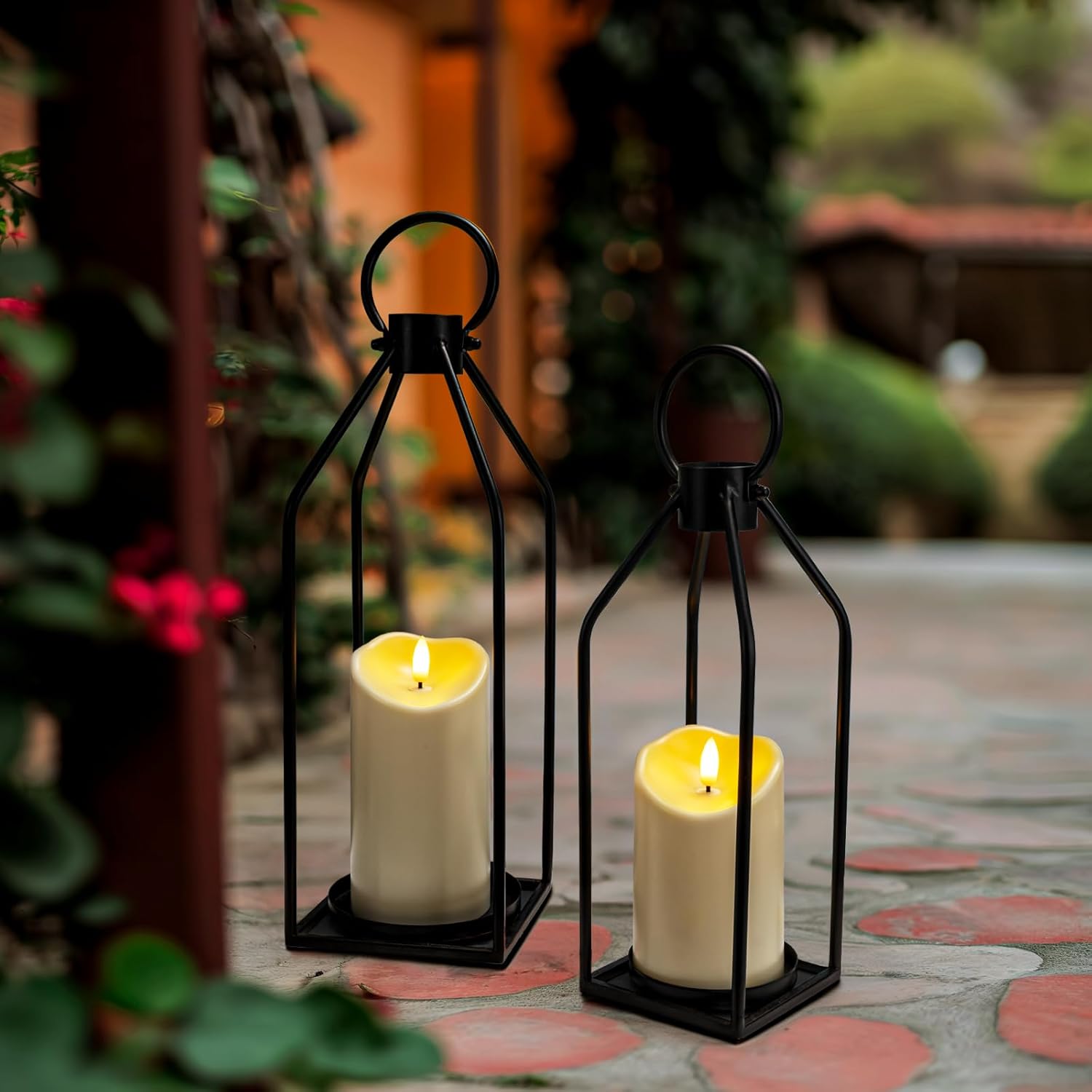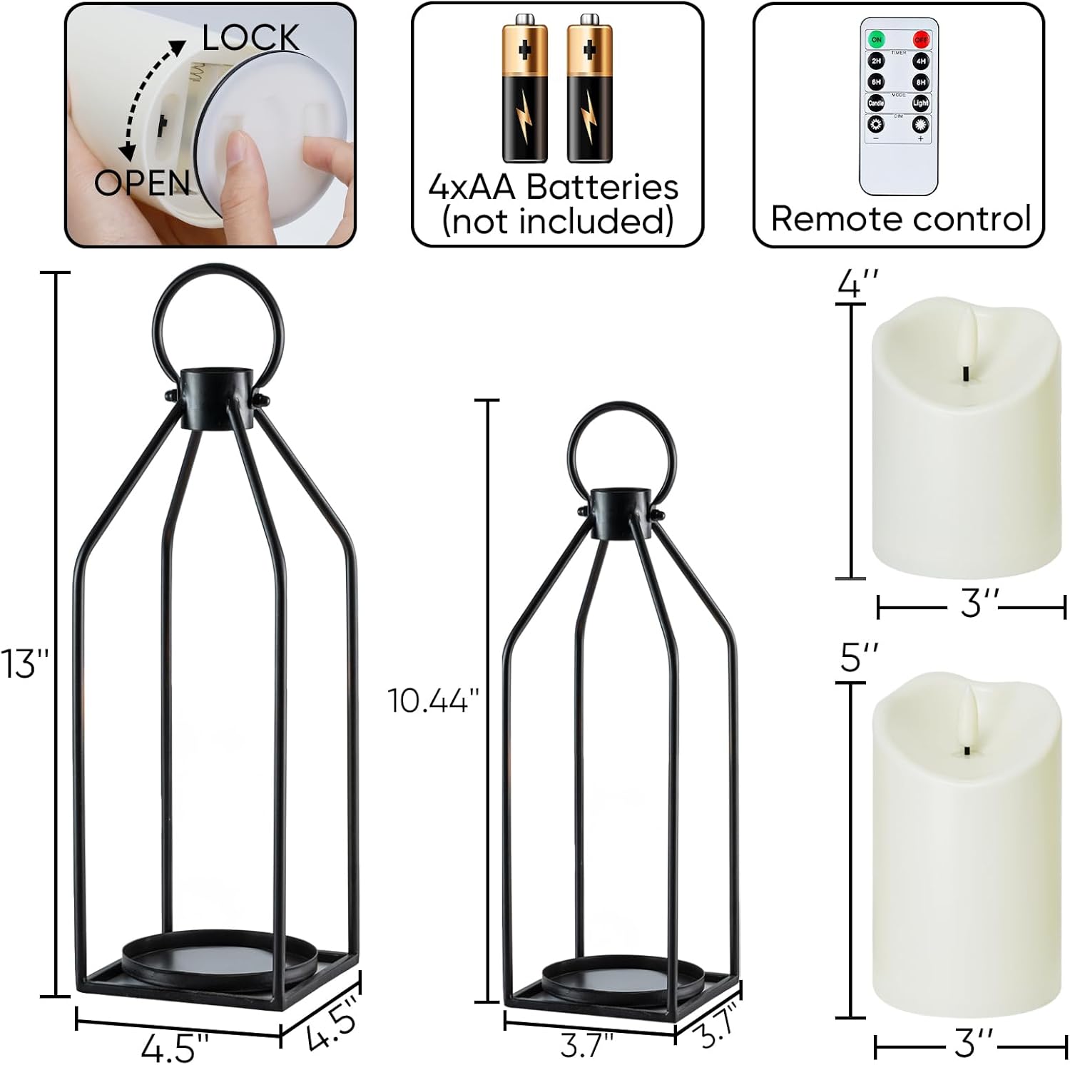 Homemory Modern Christmas Farmhouse Lantern Decor with Waterproof Flameless Candle & Remote Timer, 2PCS Black Metal Candle Lantern Decorative for Outdoor Indoor Home Living Room Patio Porch Table